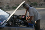 lamentablemente despues de unas horas, empezaron los problemas, el LADA de nuestro conductor….empezó a fallar, y cuando empezaron las pendientes, el coche no podia soportarlo, y fueron muchas, muchisimas las veces que tuvimos que parar en el camino para enfriar el motor y el sistema de refrigeracion, que mas que refrigerar, hervía.
