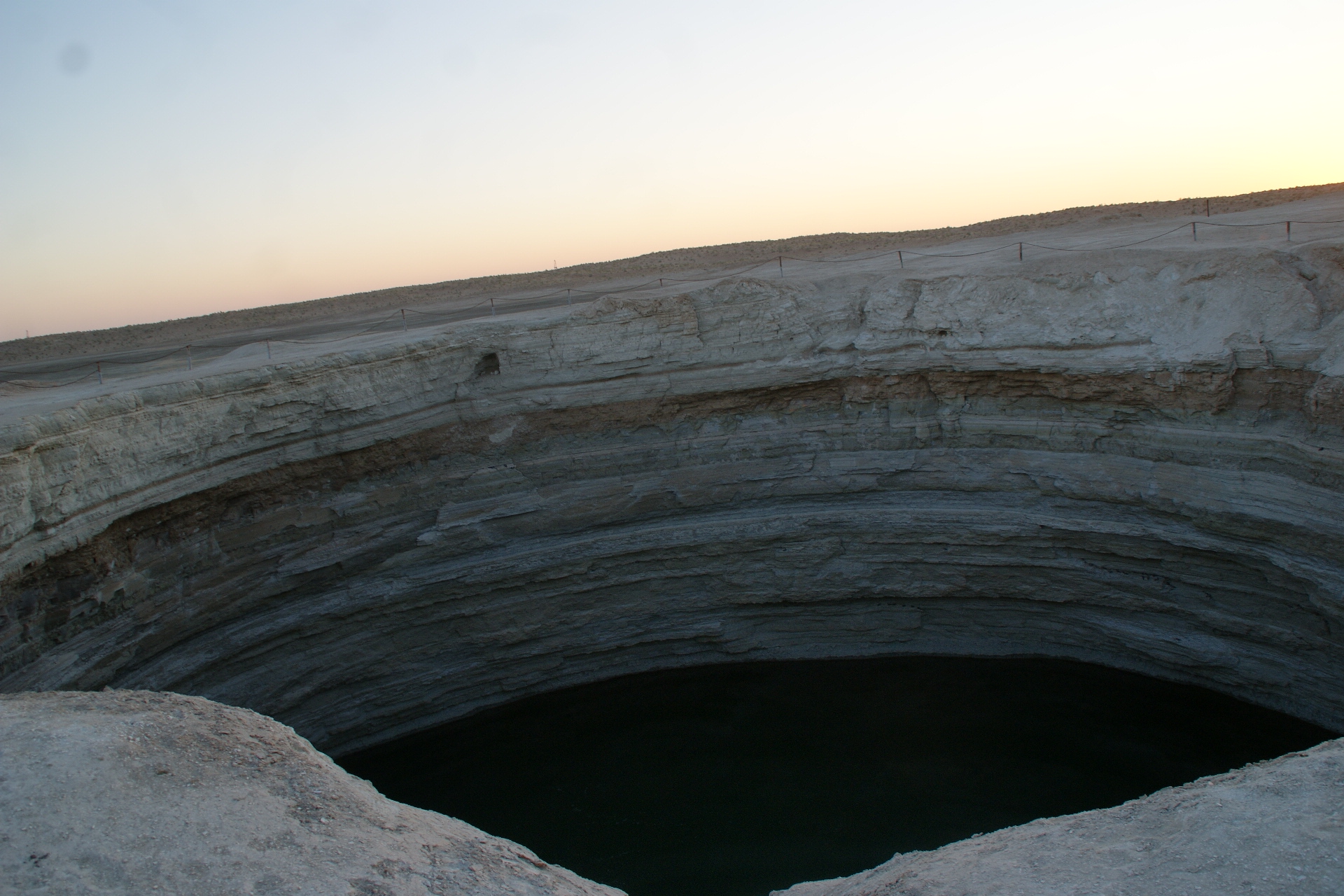 Cerca de la hora de comer, nos fuimos hasta la estacion de marshutkas, donde luego de ser acosados por mas de 10 conductores, nos pusimos en marcha por un muy buen precio hasta Darvaza, en una minivan donde ibamos unos 4-5 mas. el conductor muy simpatico, tambien nos hizo algo de turismo, y nos detuvo en un crater cercano a Darvaza, el crater de agua burbujeante, donde hicimos oracion por la gemte que vivia en la zona y murió al ceder el terreno.