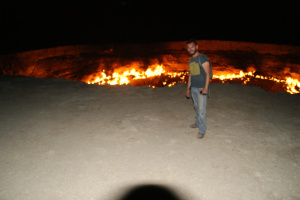 llegamos al crater….y no estabamos solos habia una turkmena con 2 chicas francesas, con las cuales conversamos un poco y luego nos dedicamos a recorrer esa curiosidad en el medio de la nada, la cual ofrece un espectáculo unico, producto de un intento sovietico de extinguir una cueva de gas natural….que lleva ardiendo 40 años.