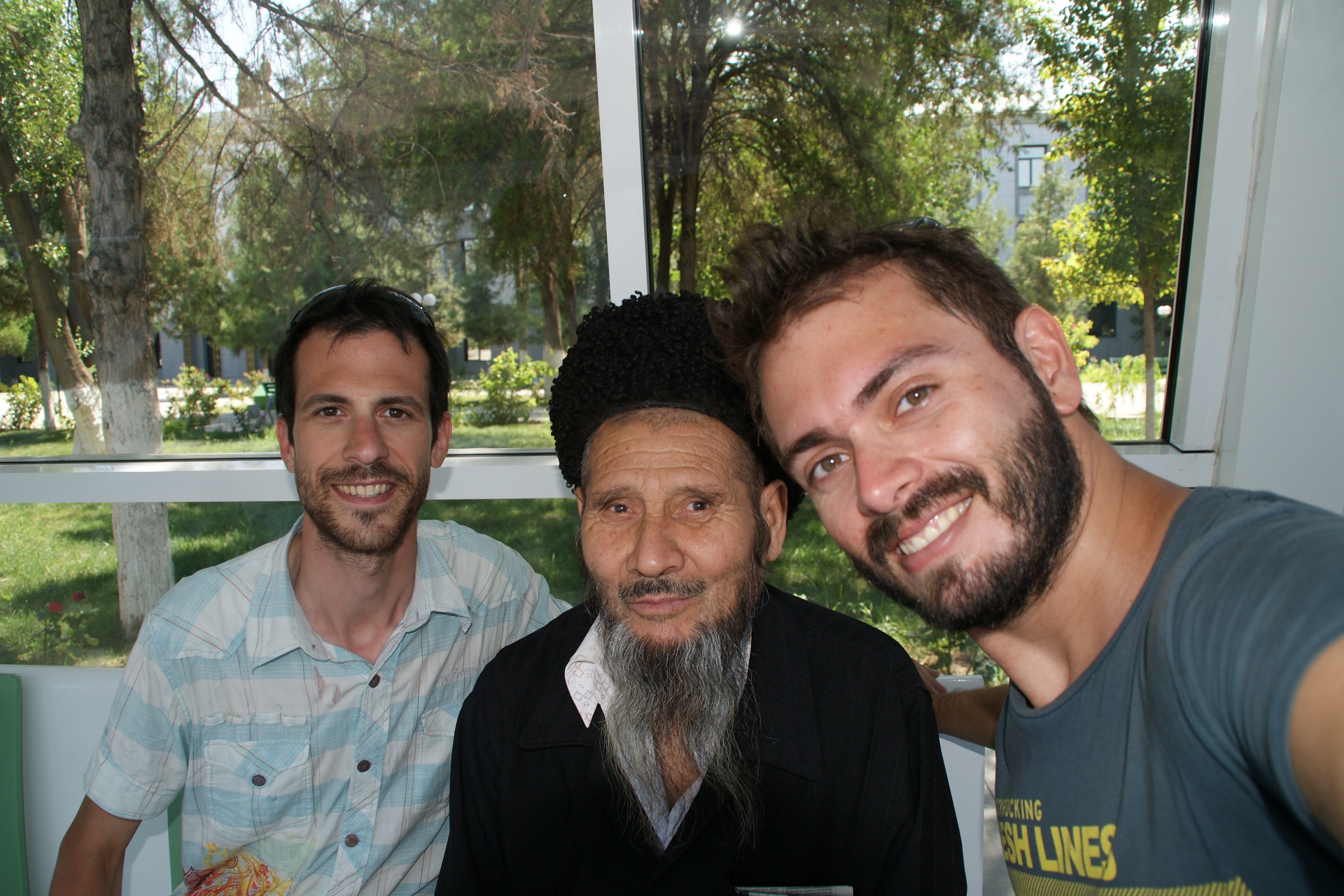 Nos fuimos hasta la Turkmenbashi navoyi, que es la calle principal y desde la cual se puede cruzar la ciudad en medio de todos los edificios más lujosos de la ciudad, palacio presidencial, universidades…todas en un blanco impoluto, cúpulas doradas…y soledad, prácticamente no había nadie en las calles, excepto un «typical turkmen man»quien accedió a hacerse una foto con nosotros, sobretodo al saber que eramos de España