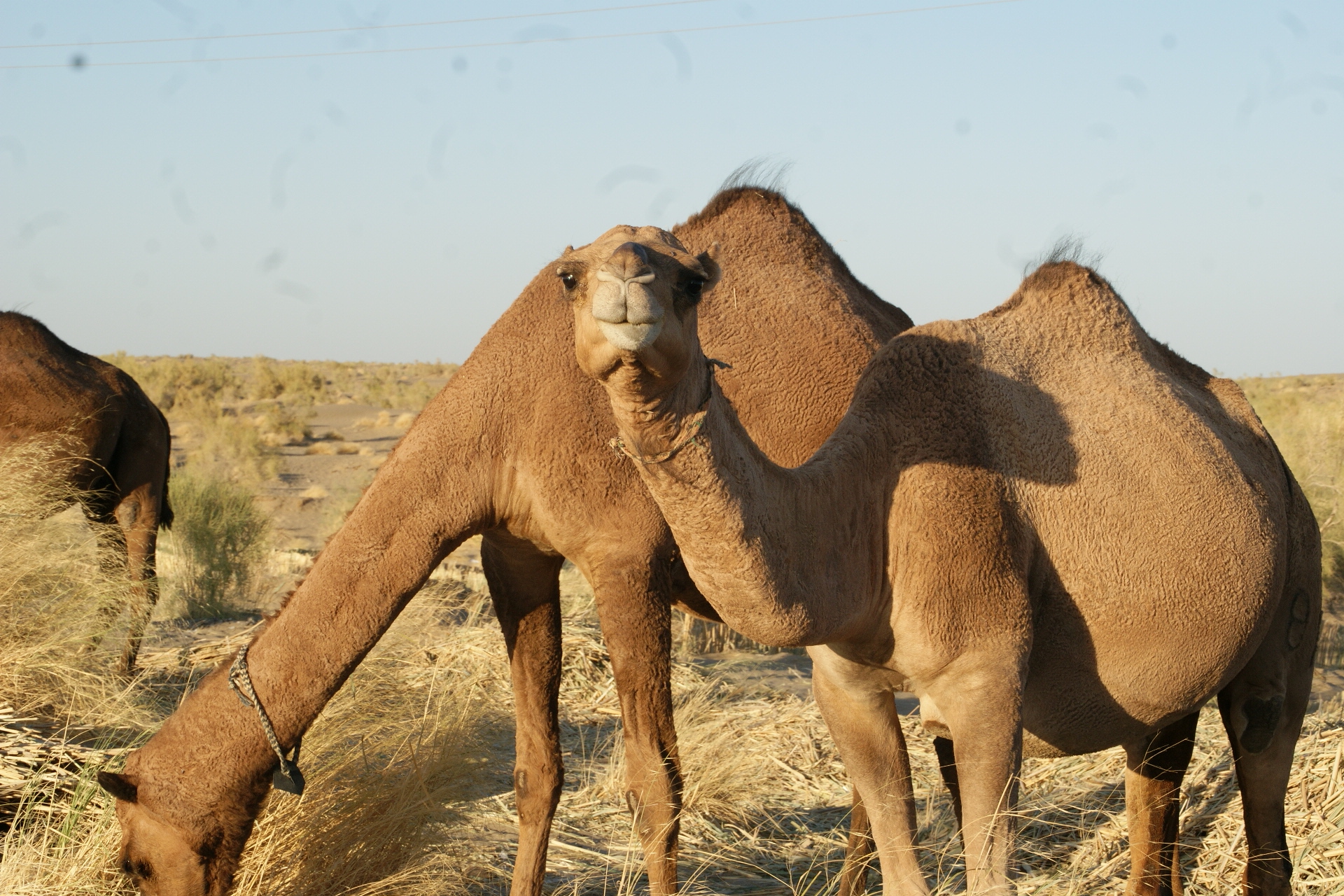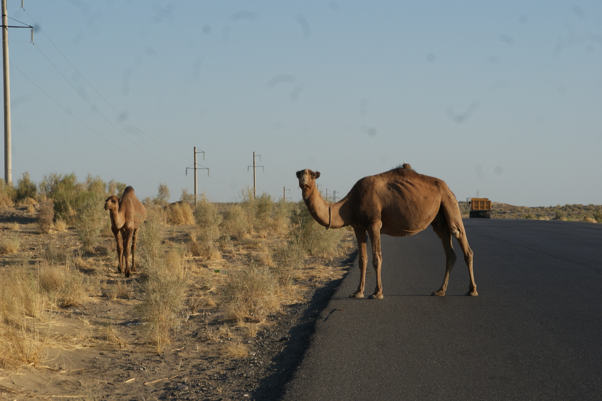 el sol tocaba el horizonte y ya estábamos en la region de Darvaza, de hecho, los camellos nos dieron la bienvenida mientras al otro costado el resplandor rojizo del cráter nos indicaba que estábamos cerca.