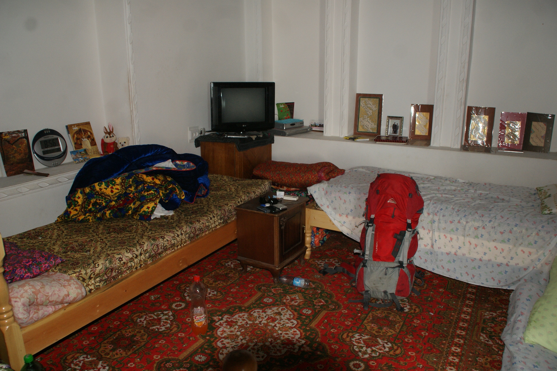 la llegada a Bujara fue con discusión incluida, ya que habiamos dcho que el taxi nos dejara en el centro, pero estaban las calles cortadas por la preparacion del dia de la independencia…y nos queria cobrar mas por lo que habia gastado! asi que nos dejó a un lado de la carretera, y caminamos unos 30mins consultando los precios de alojamientos de los sitios cercanos…50€!!!, asi que nos fuimos acercando a la parte de la ciudad vieja, el Ark, donde estaban ya los b&b y sitios similares….el elegido, el Madina&Ilios, muy cerca del centro. 8€ por cabeza, con desayuno