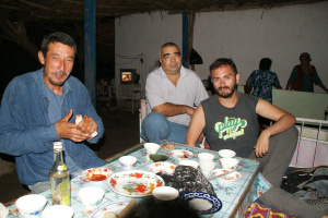 al rato se suben 2, uno de Tayikistán y otro de Kyrgyzstan, y comenzamos la ruta hacia Urgench…uno de ellos venía algo pasado de alcohol, y cuando pensamos que iba a ser un viaje desastroso, resultó que nos invitaron a cenar a las orillas del río Amu Darya, donde ellos se arriesgaron a comer peces del río (que estaba hecho algo mierda)…nosotros nos fuimos a la segura con los sheshlik