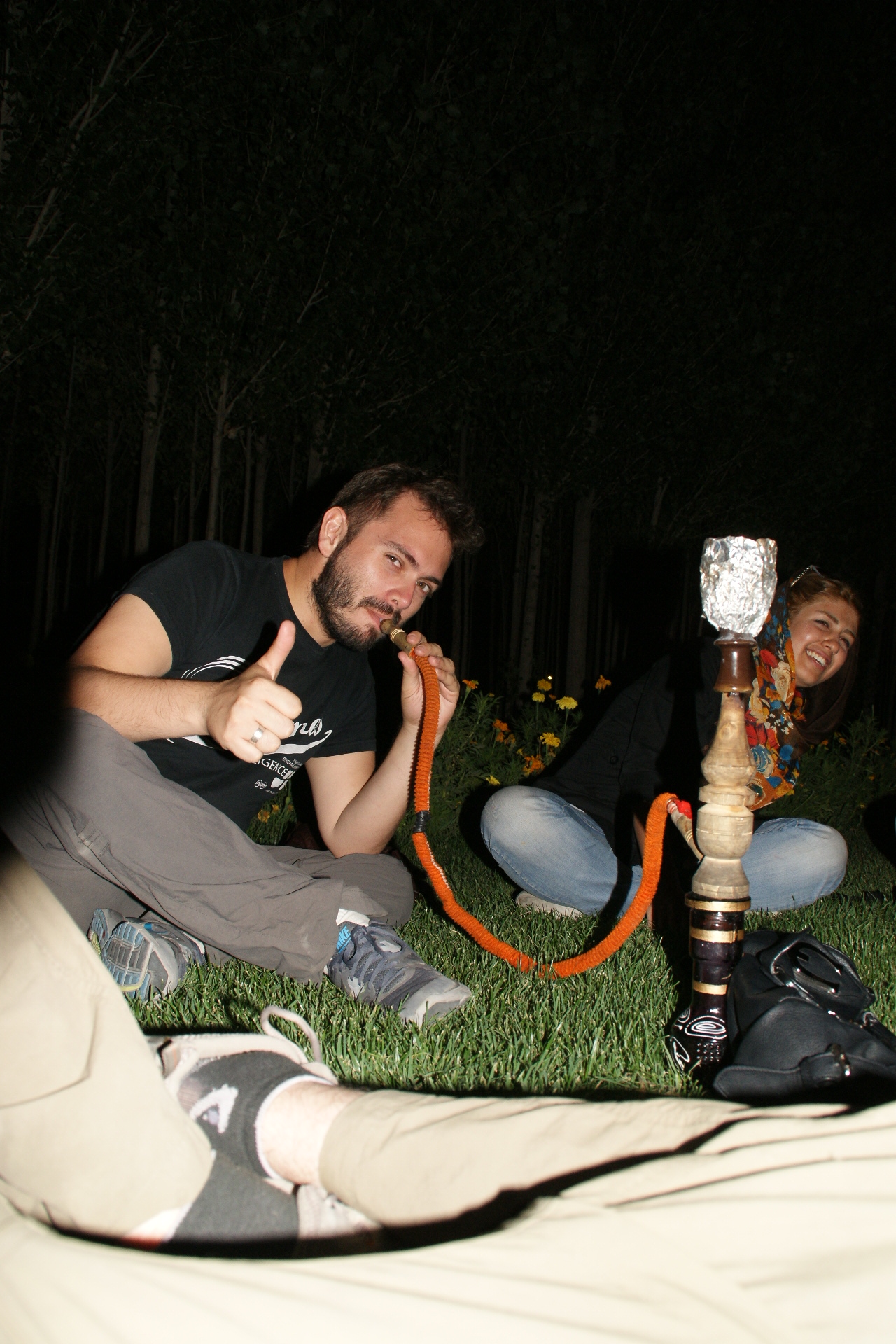 nos pedimos unos kebab en un puesto de la calle, y nos fuimos al parque a oír música y a fumar shisha…(la shisha 1€) y donde coincidimos con Amir, un chico que es profesor de español y que se nos unió en nuestro viaje a Persepolis a la mañana siguiente.