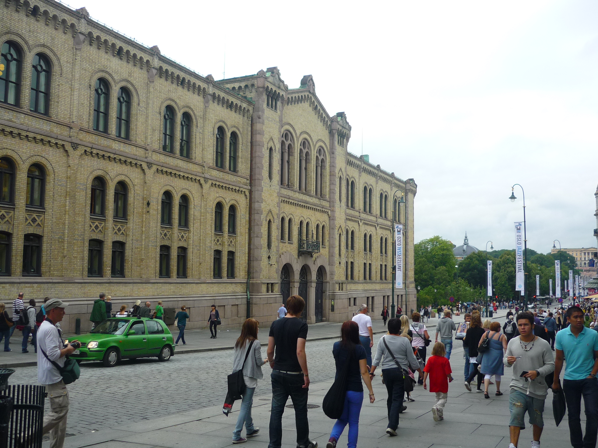 Llegué finalmente a Oslo a las 1500, y recordé que aquí hay coronas, así que a cambiar y a comer algo… salgo de Oslo y justo en frente tienes la avenida principal que pasa por su avenida comercial, su museo, su iglesia, su universidad y los jardines de palacio y el palacio real