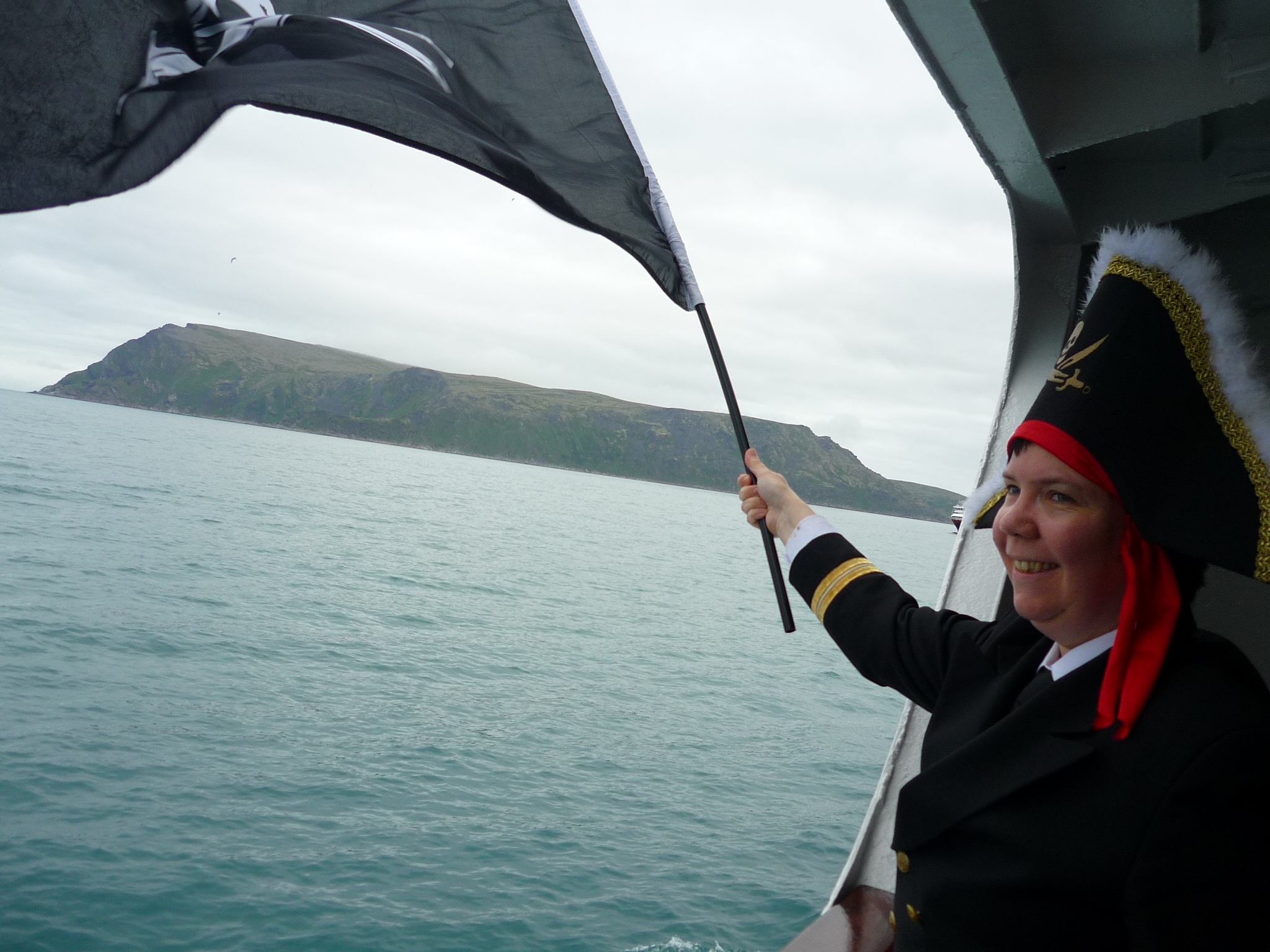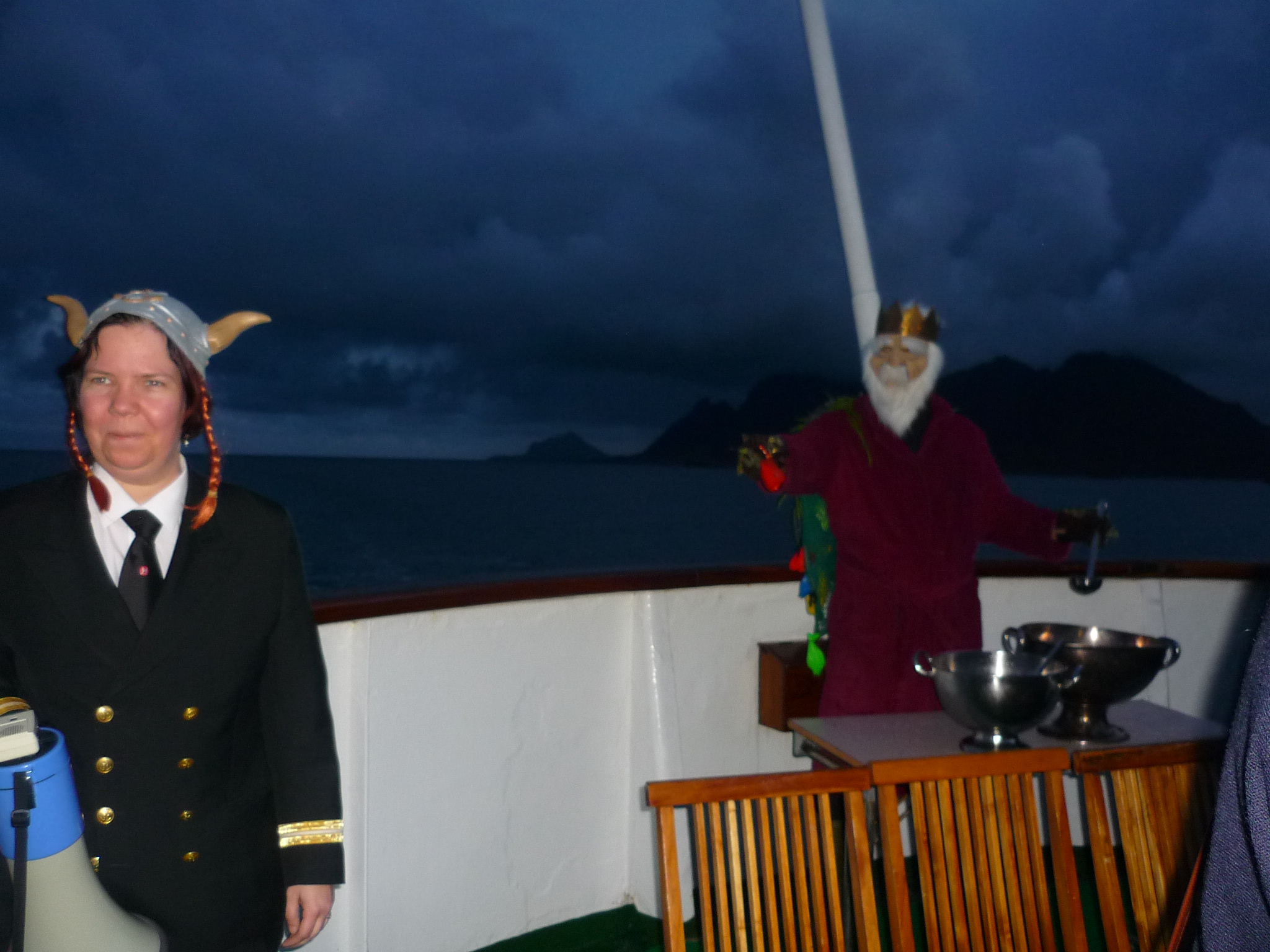 En ese momento vi a la pareja española y me presentaron a otra pareja de Madrid, así que ahí haciendo migas hablamos un buen rato, hasta que vimos en el horizonte una muralla…era el paso de los últimos fiordos….el Trollfjord, ahí apareció Neptuno….parecía Papa Noel de capa caída hahahaha, y nos bautizó a cada uno con agua del Ártico, para luego una copa de vino….