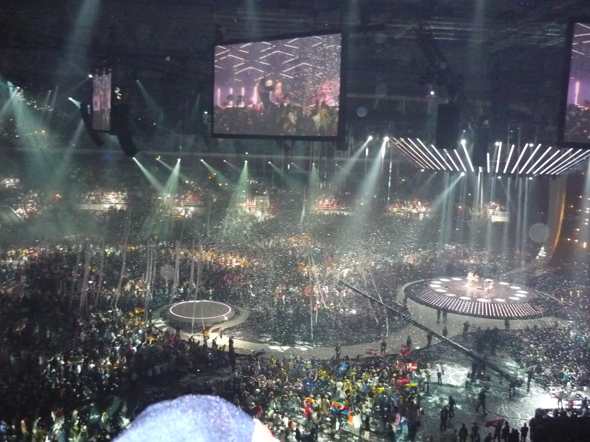 después de descansar nos fuimos hacia el arena, esta vez estábamos en las alturas, pero aun así una vista y ubicación bastante buenas, esta vez había mas nervios ya que el ganador seguía sin intuirse, las actuaciones estuvieron al nivel, y todo se dio sin inconvenientes…Hungría era mi favorita, lastima que quedara mal, España quedo peor aun, el ganador, Azerbaiyán, pues no merecedor ni por voz ni por puesta en escena, una versión mala de High School Musical