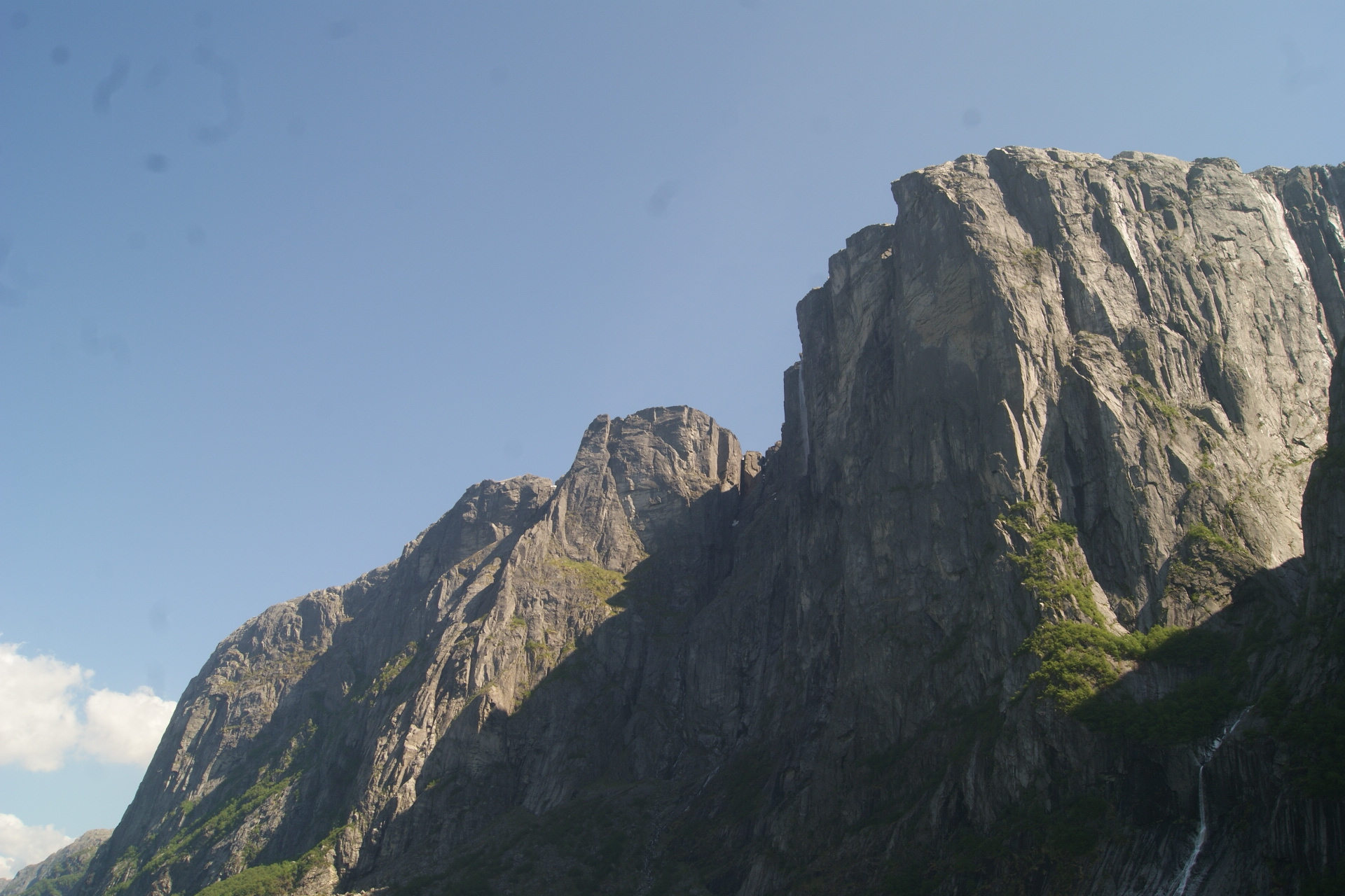 Ya entrando a Lysebotn, el paisaje es más interesante, ya que las altas paredes se alzan a tu paso, pequeñas caídas de agua que hacían resonar en el aire, hasta que en lo alto, vemos la plataforma de Preikestolen… formación a 700mts de altura que hace de mirador del fiordo al cual iría el Lunes.