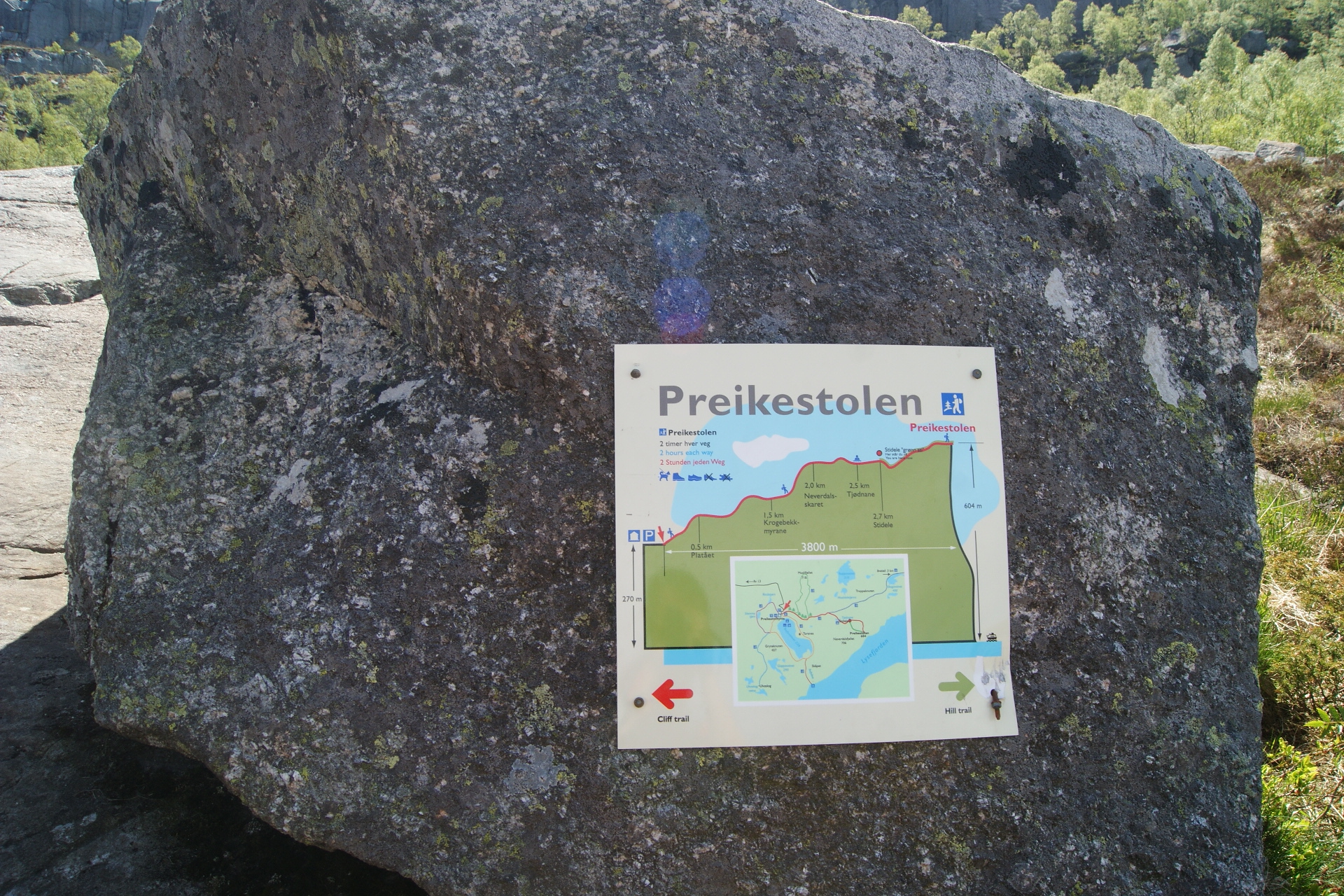 Al llegar la ruta era sin perdida, subir, primero en pendiente, luego entre rocas sueltas, pero bastante más fácil que la ruta al Kjerag sobretodo por que está bastante señalizado, cosa que se agradecía, y mucho mas transitado , ya que ofrece menor dificultad que el Kjerag. Entre paradas de fotos y tomármelo con tranquilidad, el ascenso fue de 2 horas.