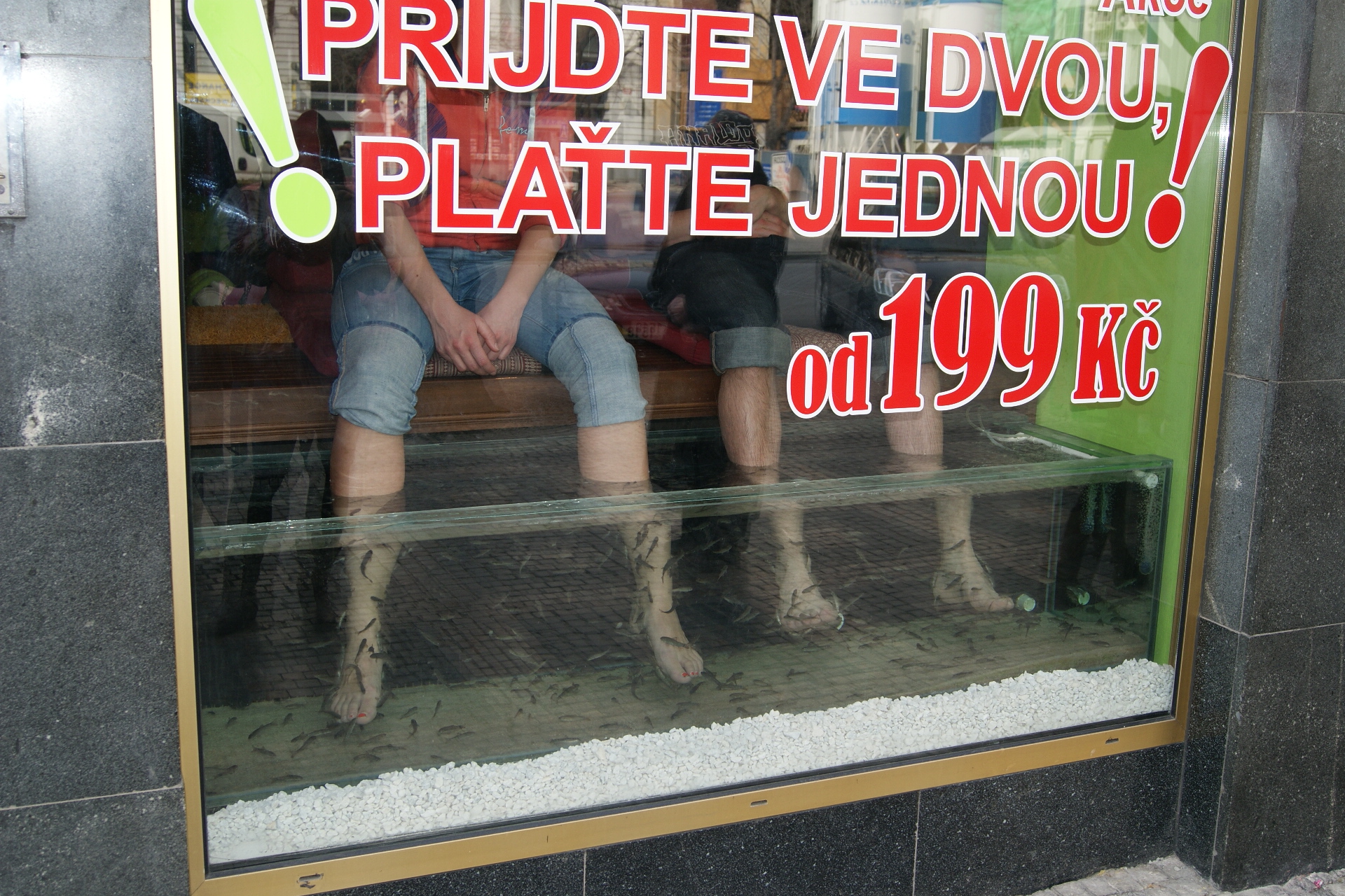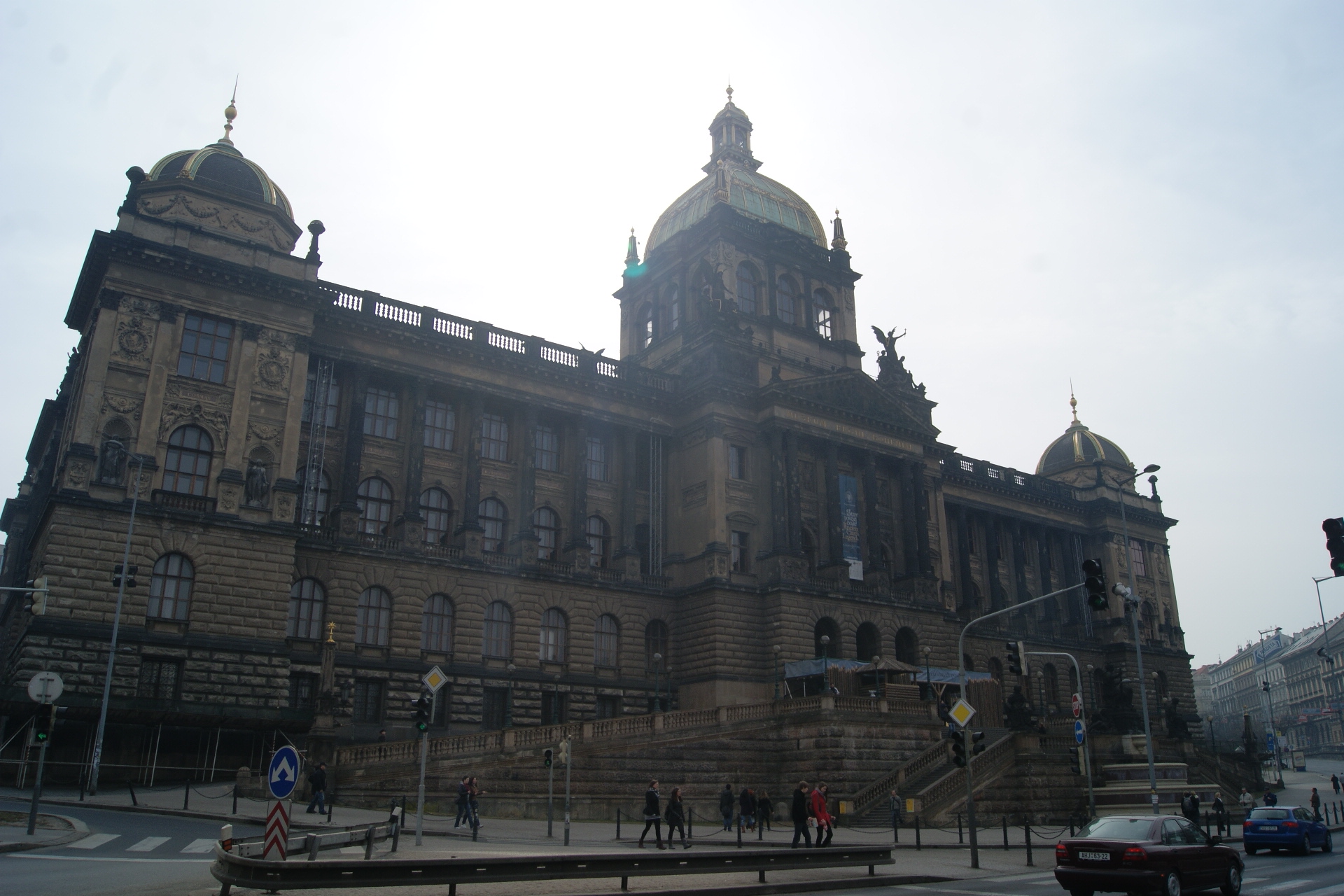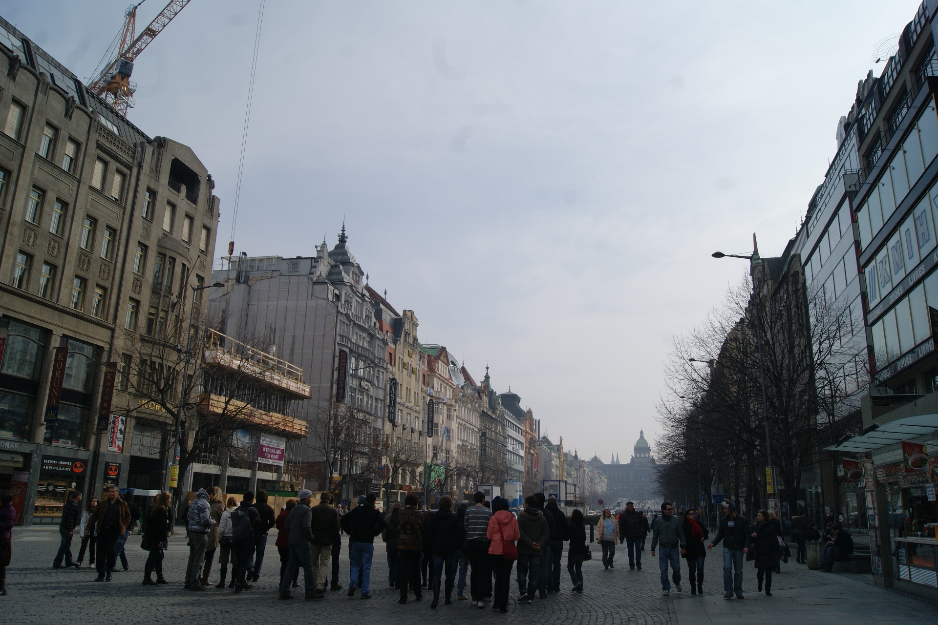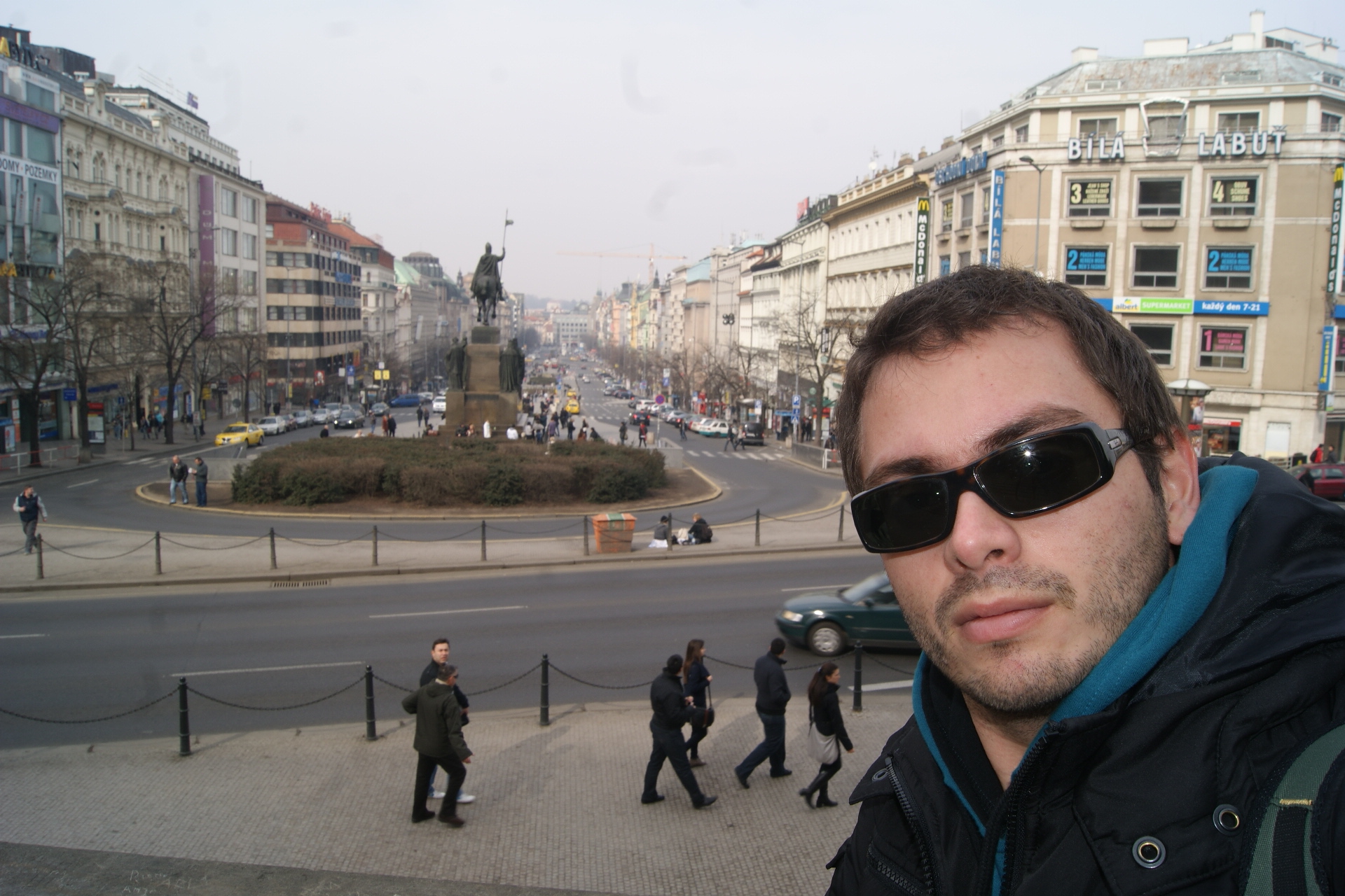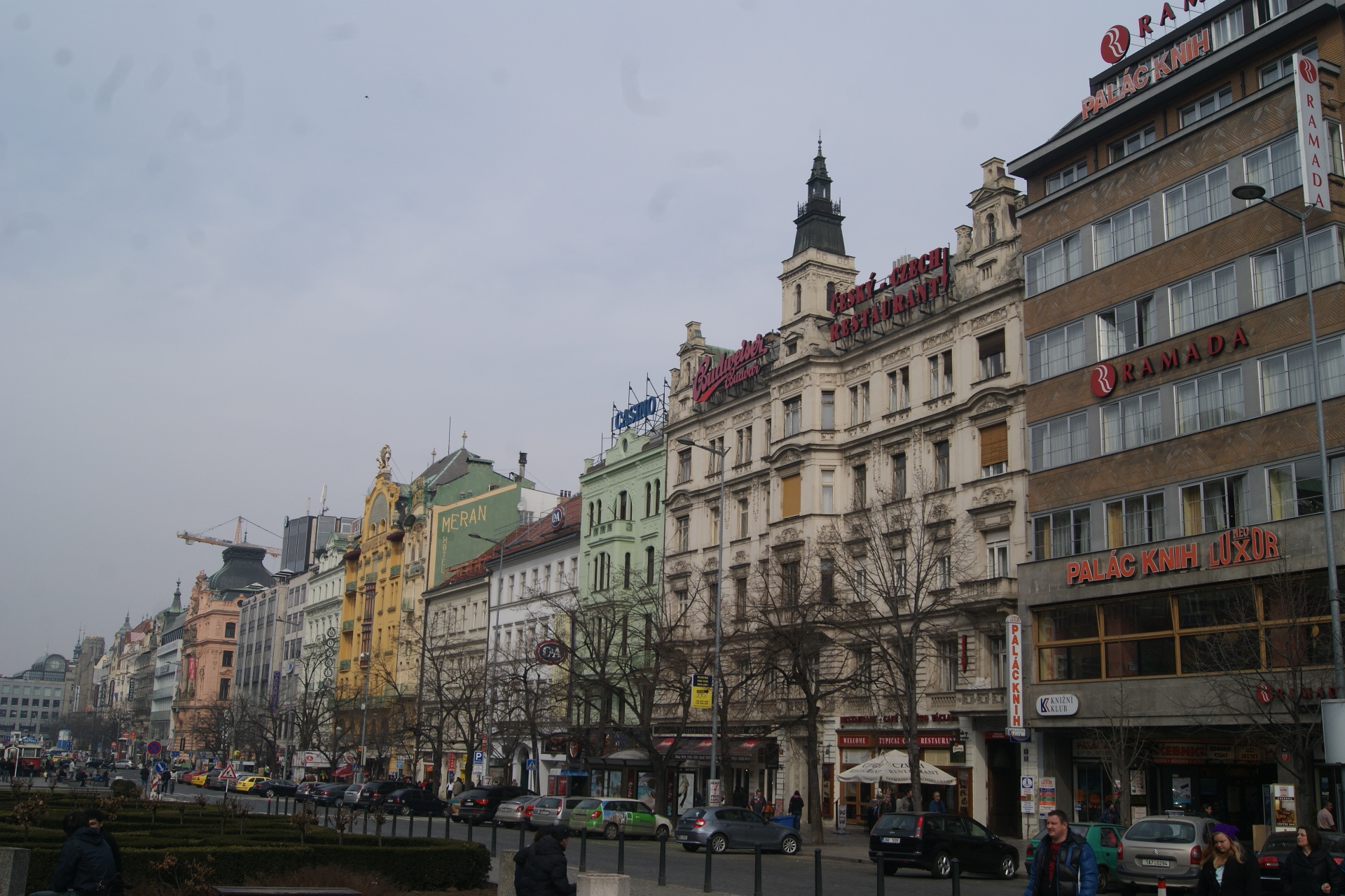 desde lo alto del museo nacional se puede ver una gran avenida que baja hasta la ciudad vieja, el casco antiguo, esta avenida es la Wesceslas Square, dominada por el gran edificio el museo, el monumento a Jan Palach (mas adelante), un gran paseo peatonal que baja, y a ambos lados, edificios nuevos con tiendas de ultima moda, así como arquitectura local mezclada entre ellos, gracia me hizo escuchar en alguna esquina a las azúcar moreno cantando, creo que era una tienda de chinos/hindúes, así como un puesto tipo acuario, el cual contenía peces (nada raro) acompañado de pies humanos (unidos a personas, no muertos, jaja) con los cuales se hacia algún tipo de pedicura o tratamiento…mis pies iban en su 2º dia de viaje así que estaban perfectos