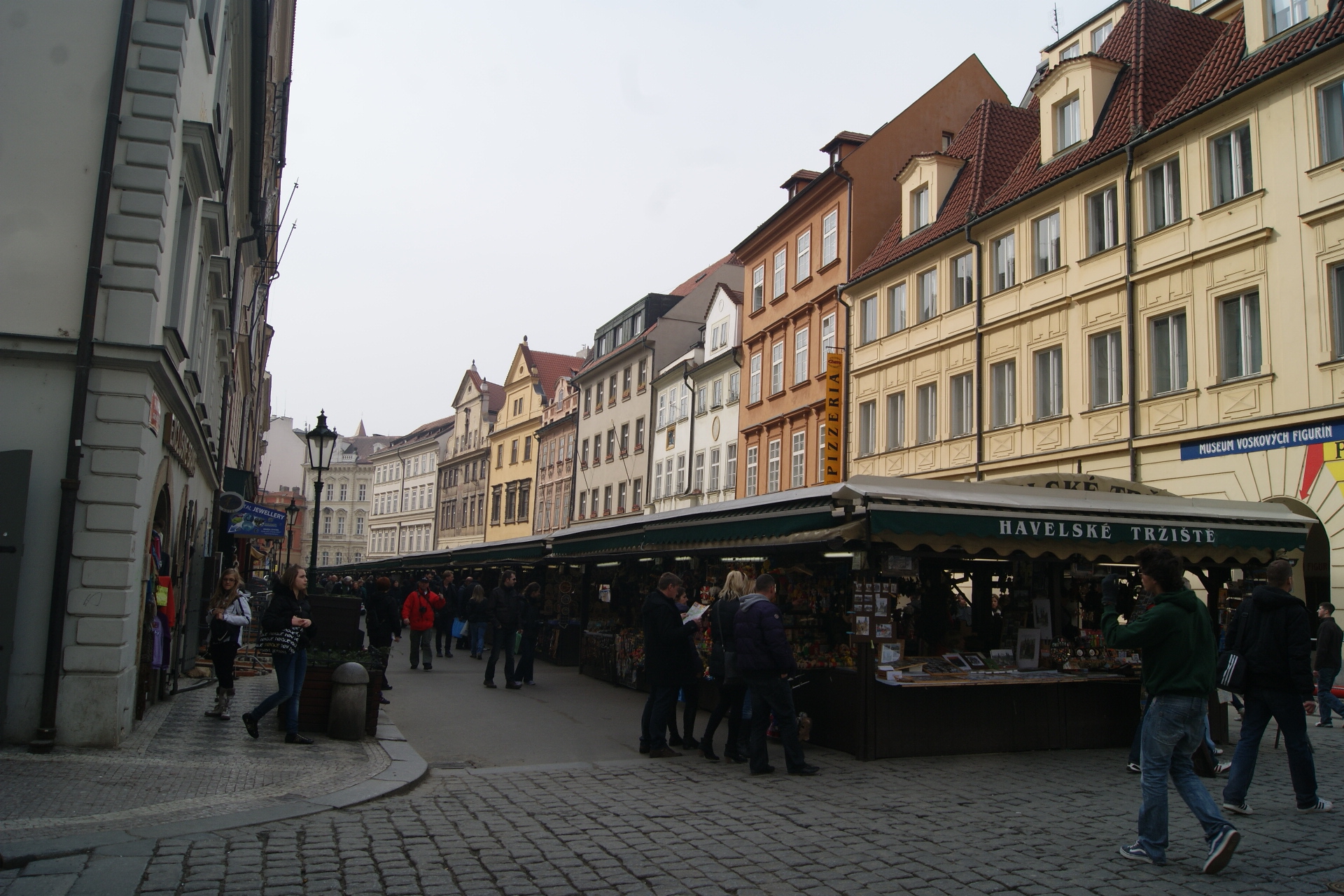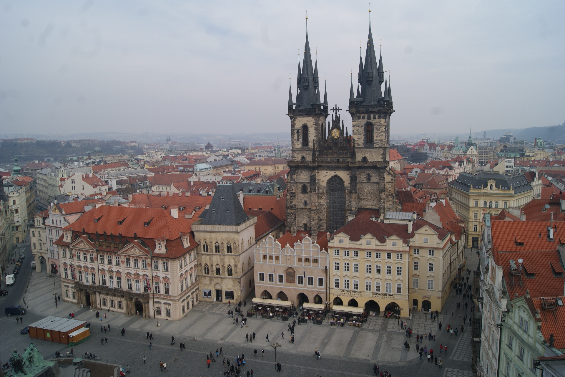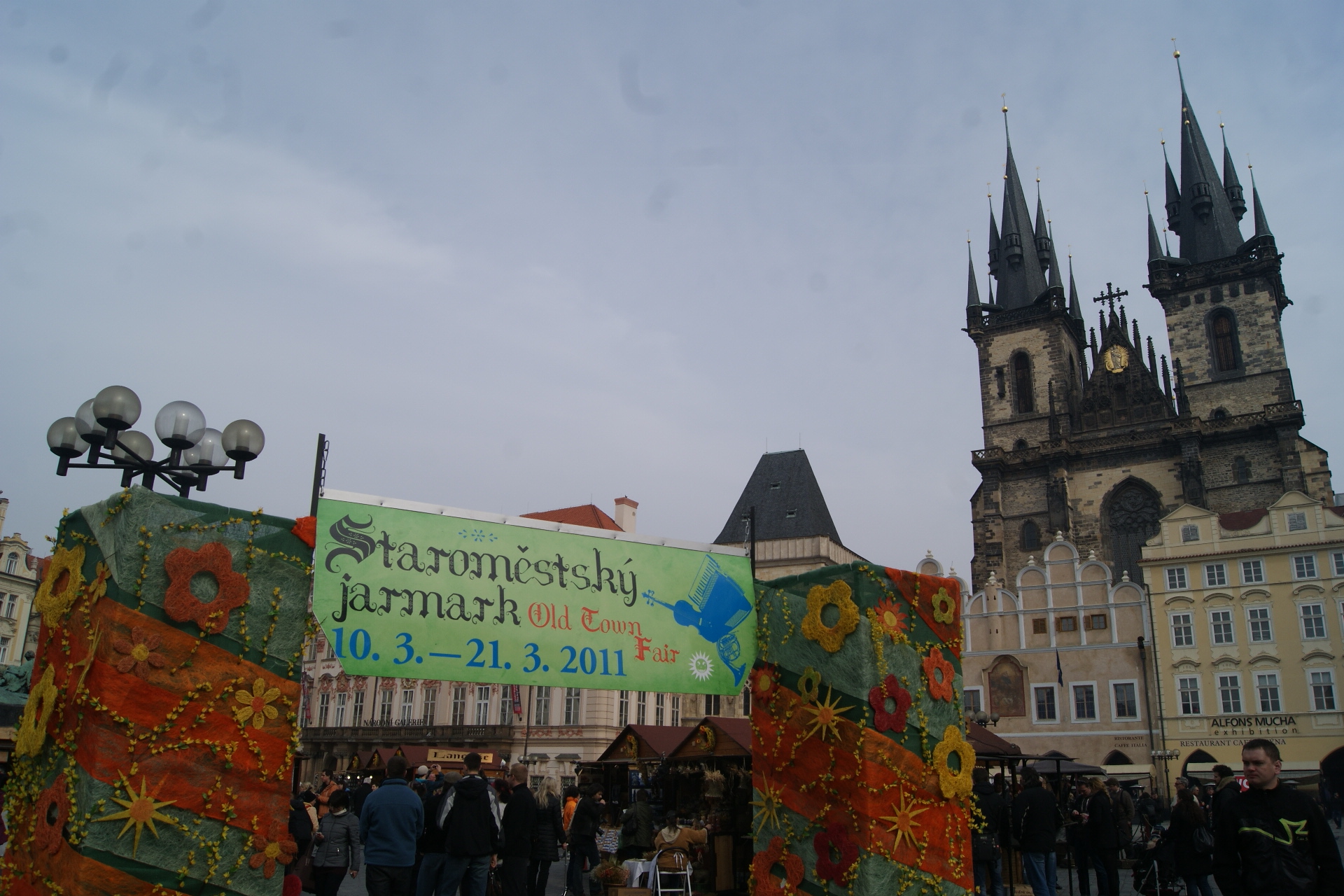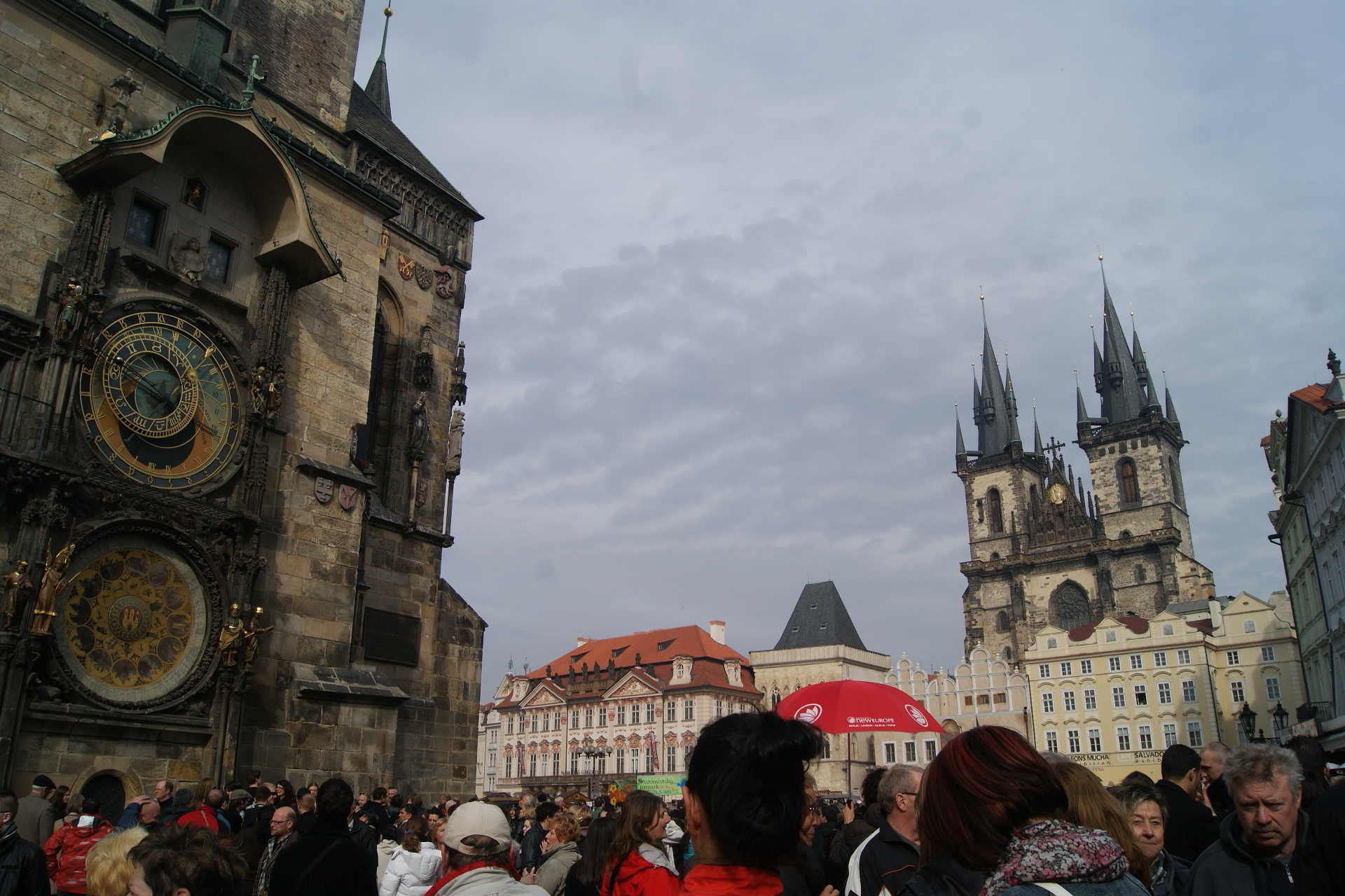 al entrar lo primero que se me vino a la mente fue la imagen de la plaza de Cracovia, amplia, cuadrada, una torre que la domina y una feria artesanal en su centro, rodeada por la iglesia de Tyn, La torre del reloj y la iglesia de San Nicolas