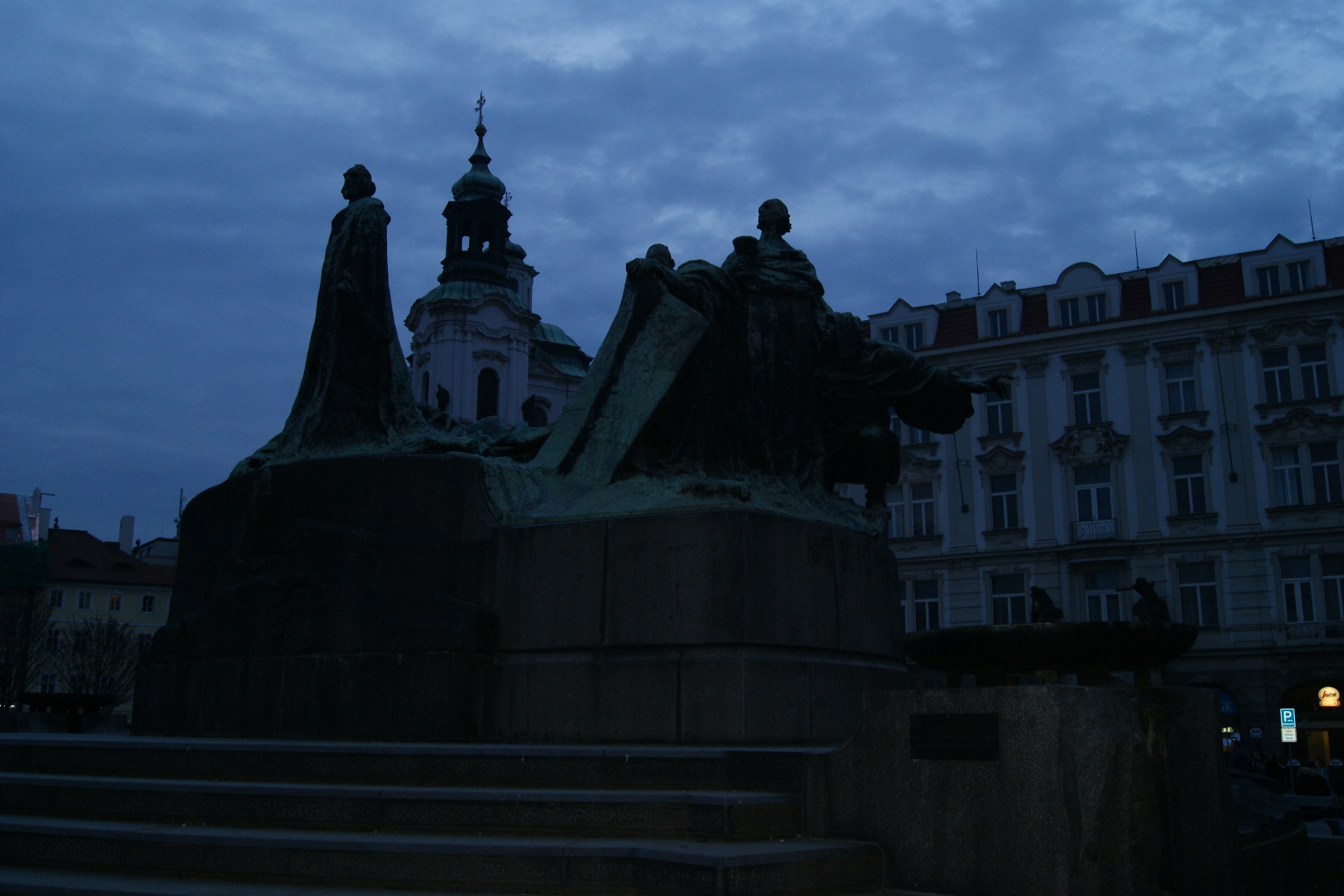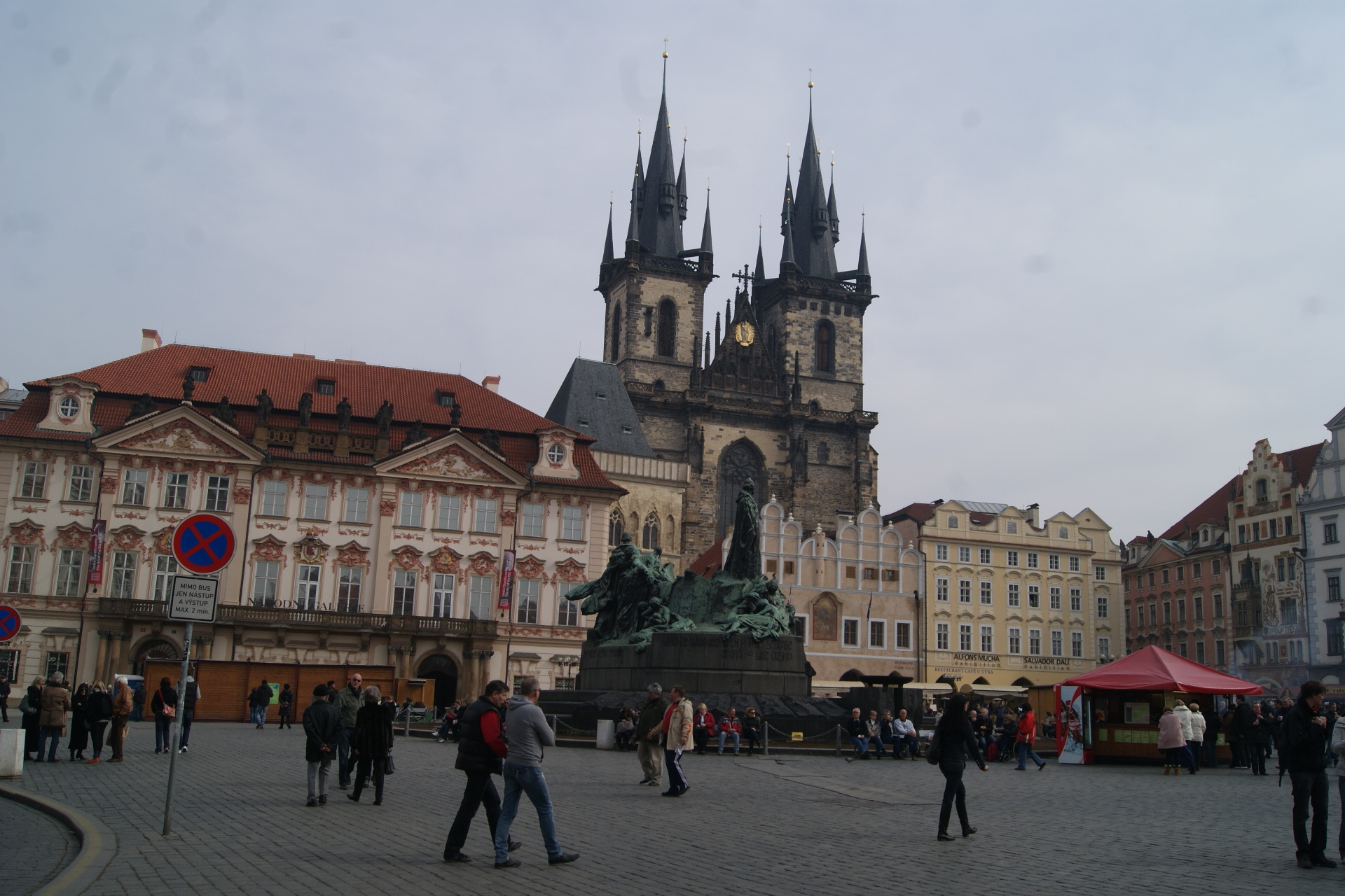todo en orden a las 14:00, donde nuestro guía nos puso como primera parada después de los saludos oficiales, en frente de la escultura de la plaza vieja, monumento a Jan Hus, protestante y líder de los Husitas, movimiento protestante el cual amenazó a la iglesia y al entonces reino de Bohemia
