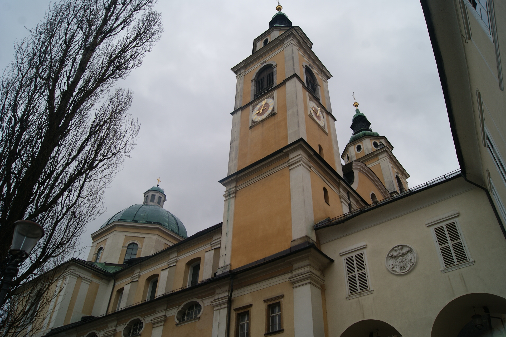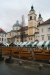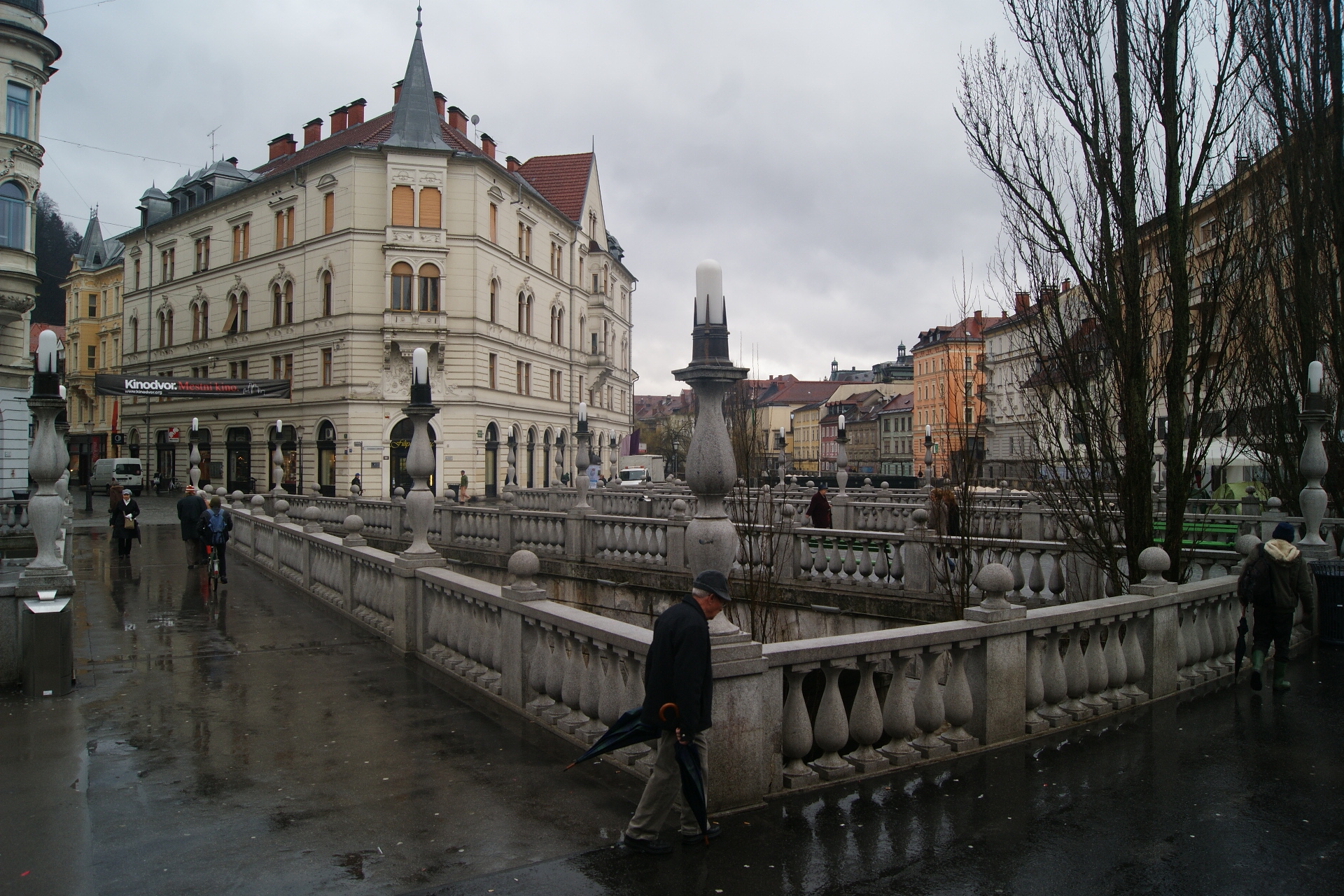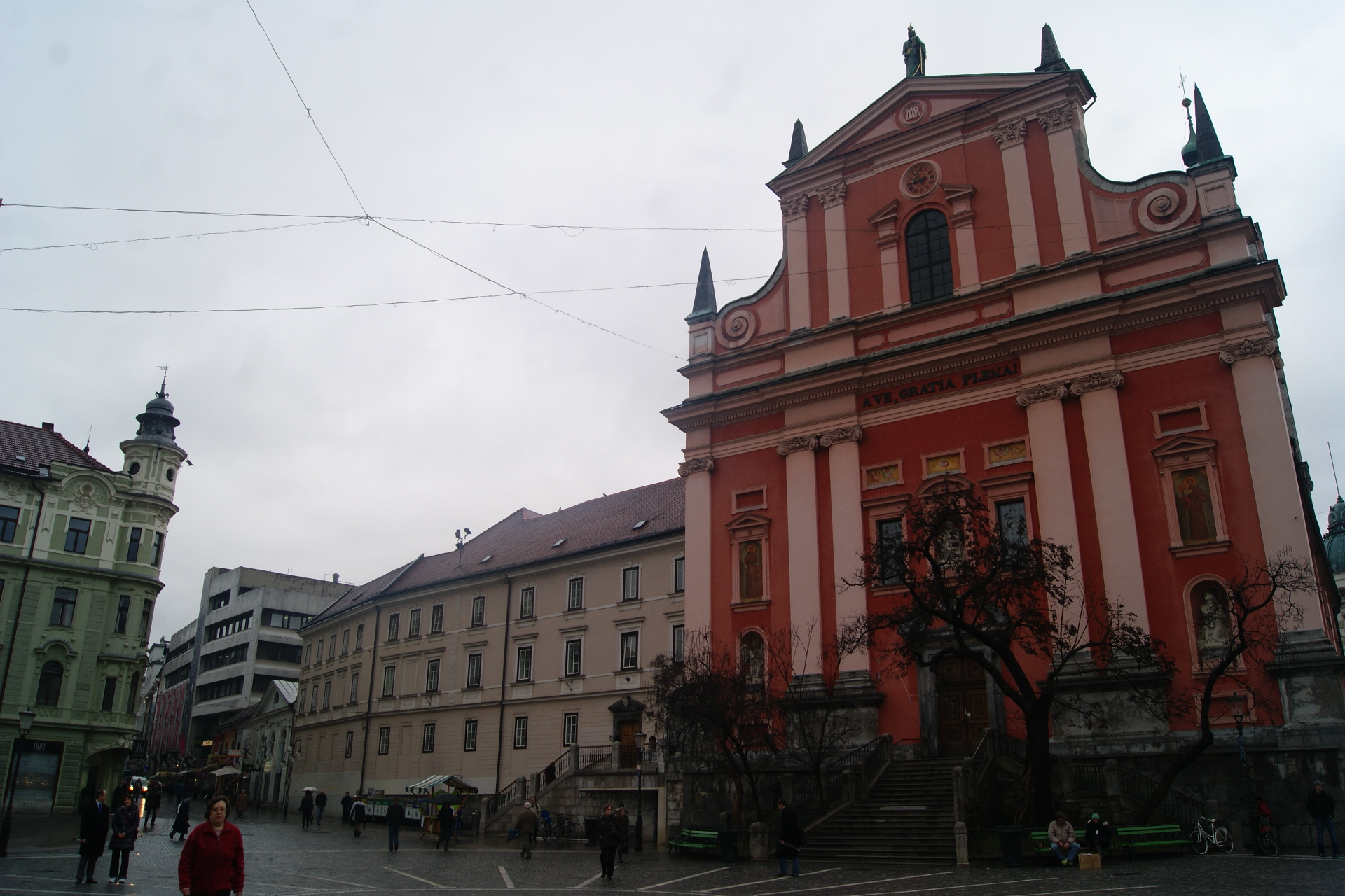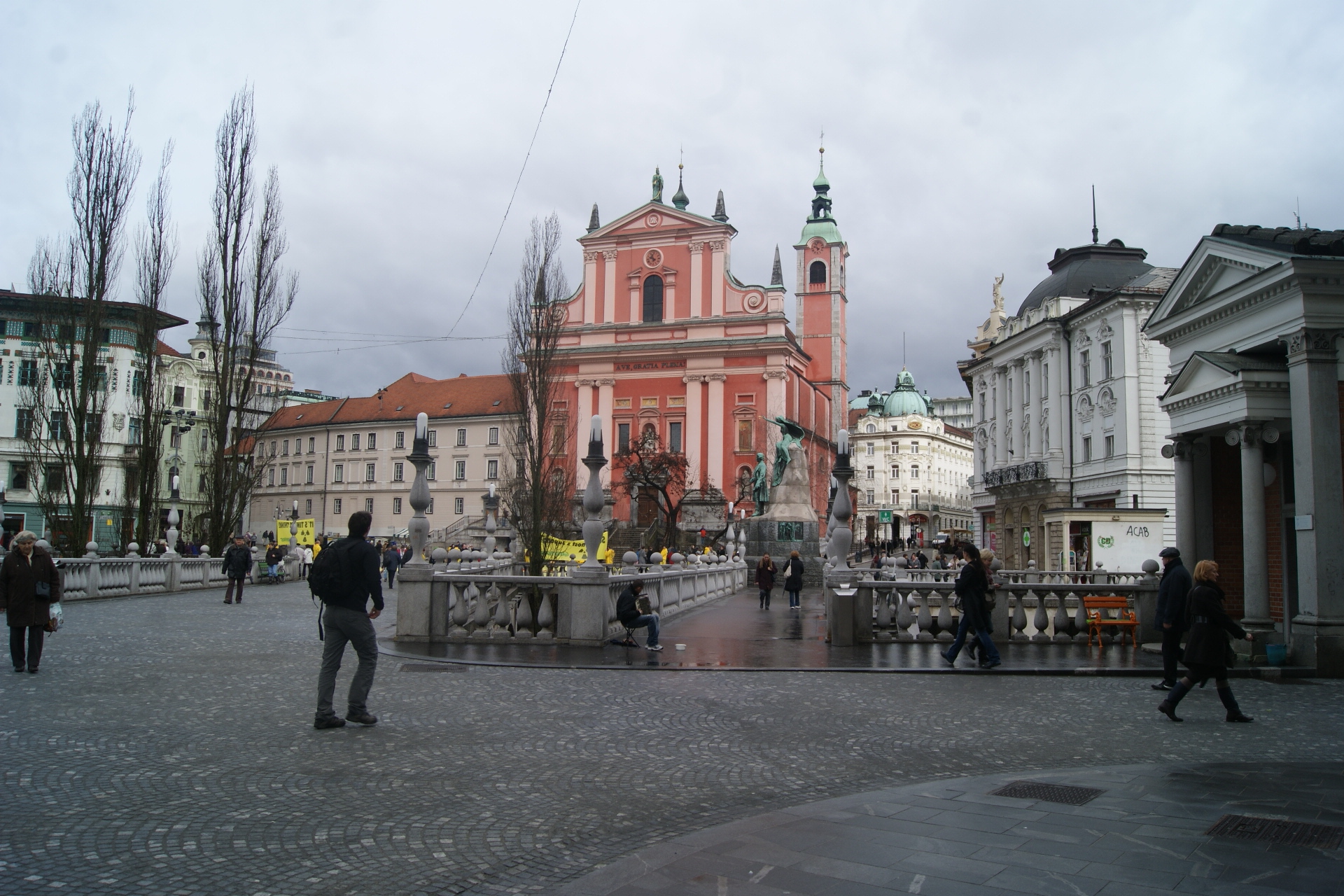 Poco andar se llega a una zona muy comercial, la cual por la hora recien comenzaba a funcionar…de caminar por edificios sin nombre pasas a ver centros comerciales, avenidas y tiendas de ropa, pero tambien se empiezan a dislumbrar torres, iglesias, calles de adoquines… crucé un parque hasta llegar a la avenida principal y de ahi bajar por una paseo peatonal comercial, hasta la plaza central, la Plaza Presernov, lugar dedicado al importante poeta esloveno Frances donde encontré también la Iglesia de la Anunciacion