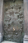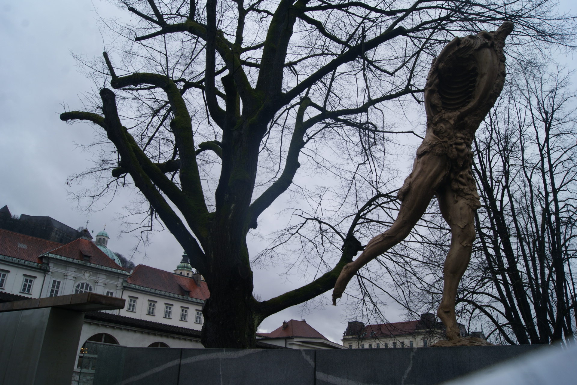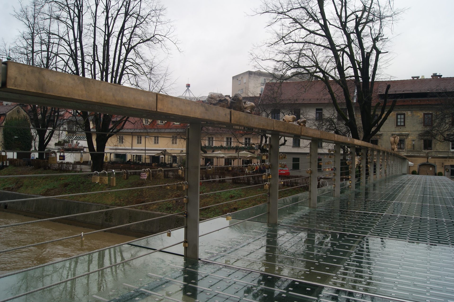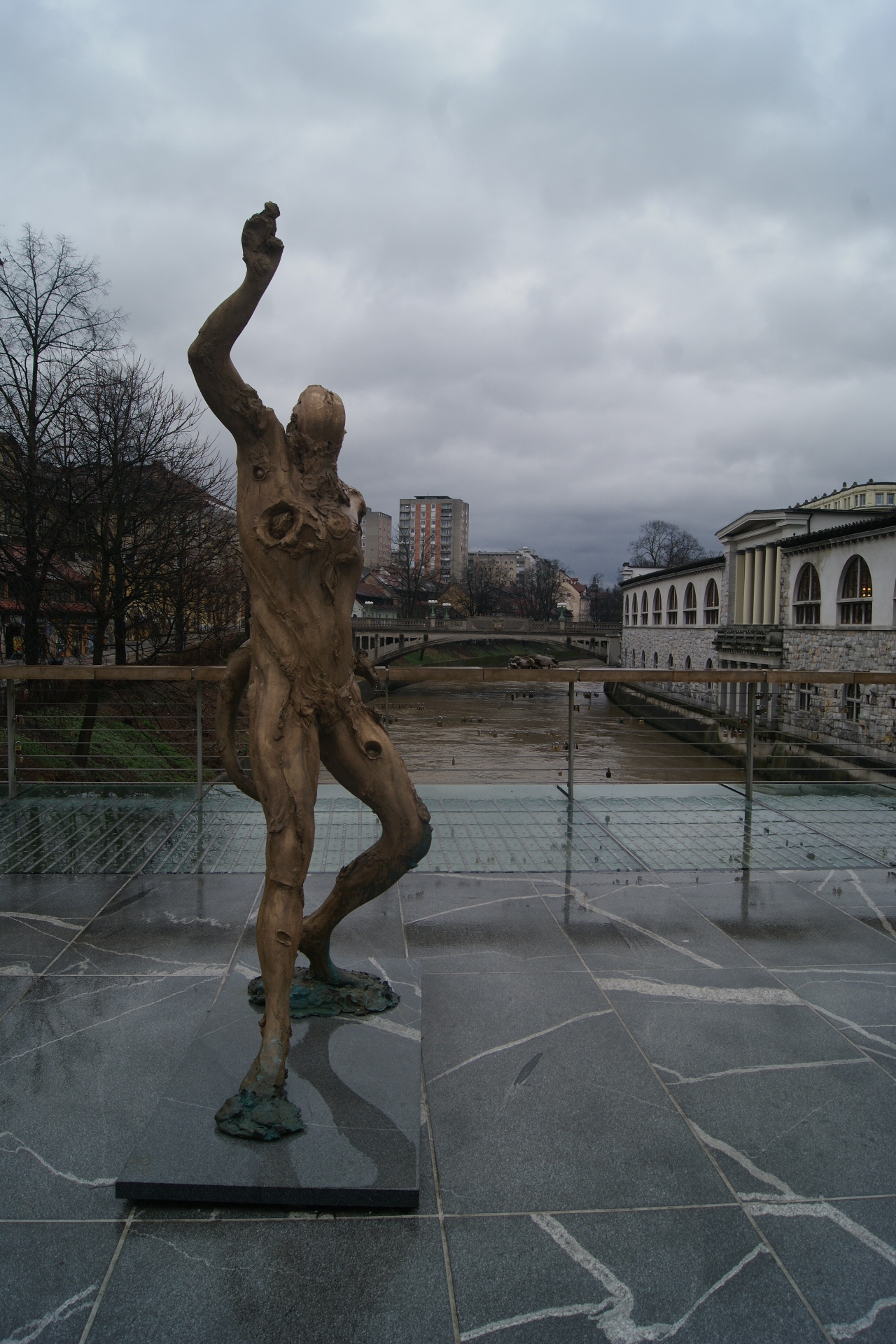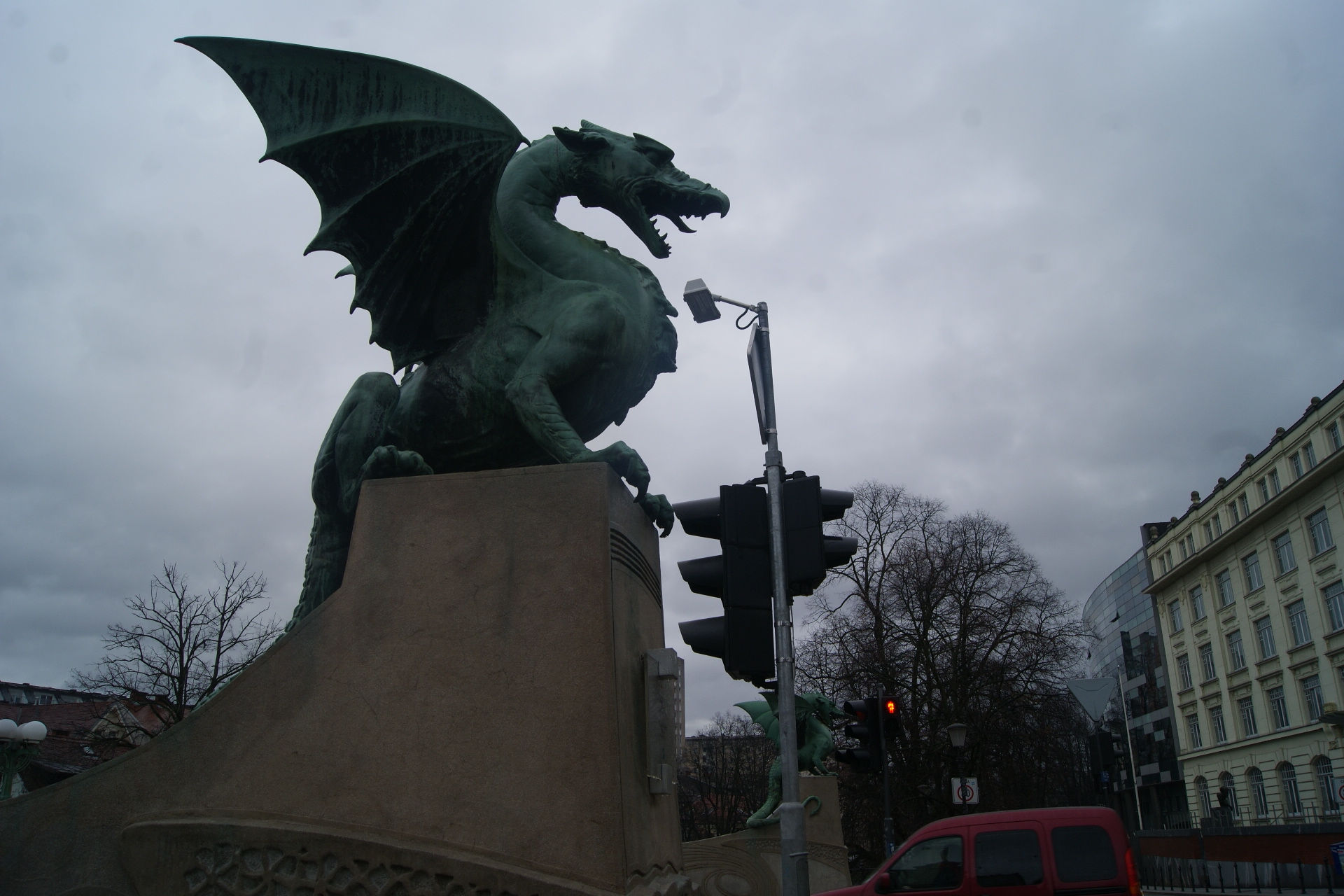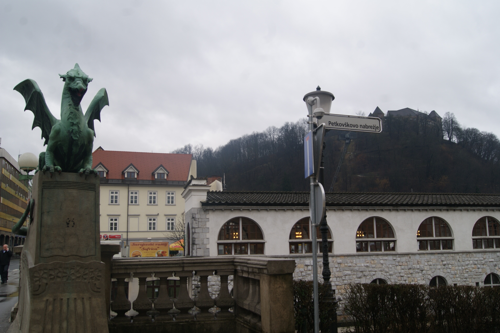 detras de el mercado, la iglesia de san nicolas, llegúe justo en momento de la misa, asi que no entré, bordeé la zona, mirando hacia el castillo que dominaba la colina, y decidí cruzar el puente de los dragones, simbolo de Ljubljana, que posee la leyenda de que si una virgen lo cruza,uno de los dragones mueve la cola (no se movio nada mientras duró mi visita al puente), a su lado, existe otro puente que llama la atencion por las esculturas que contiene, formas humanoides tamaño natural, este es el puente de los carniceros, y las esculturas que posee tiene representaciones “especiales”de entre otras, la expulsion de adan y eva del paraiso