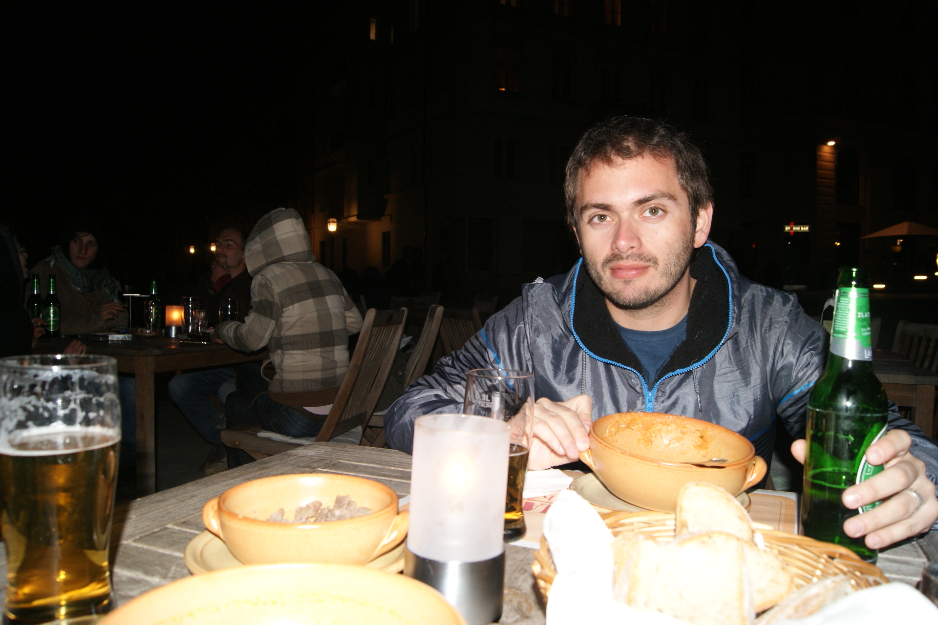el clima mejoraba, la tarde era muy agradable para dar un paseo, y eso hicimos, entramos al centro de la ciudad desde su casa, unos 20 mins de paseo, bordeando el rio y conociendonos mas, hasta que nos sentamos en una terraza para comer una tipica cena Eslovena