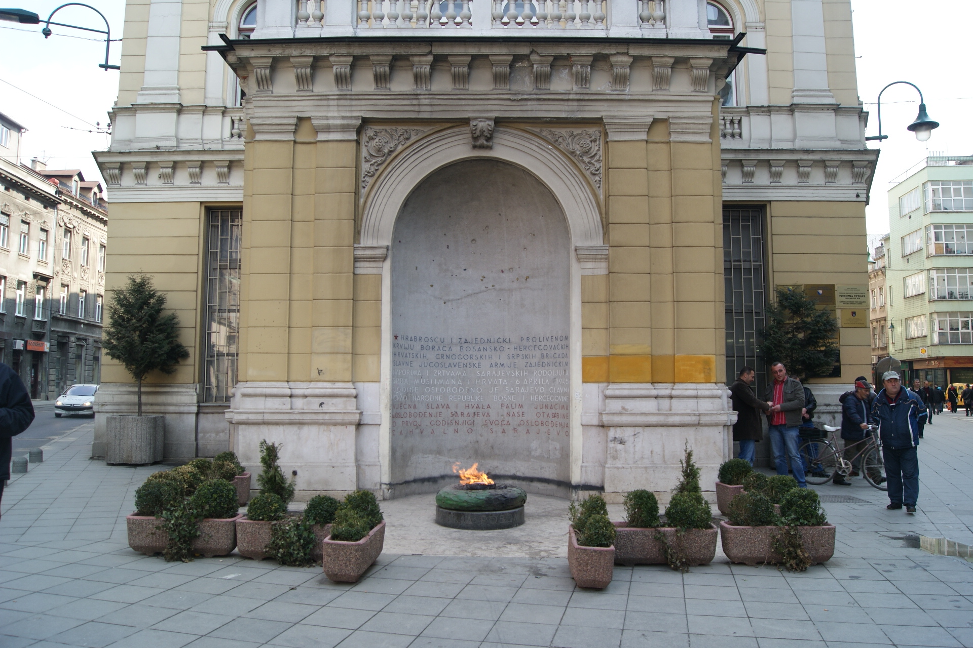 Anduvimos por el centro peatonal de la ciudad, Ferhadija, donde encontramos el memorial y la llama eterna dedicada a las victimas de la 2da guerra mundial, ademas de dar por toda la ciudad con “las rosas de sarajevo”, las marcas de los morteros en el suelo, pintadas de rojo, como recuerdo a las victimas…y como intento de enmascarar el sufrimiento de la época