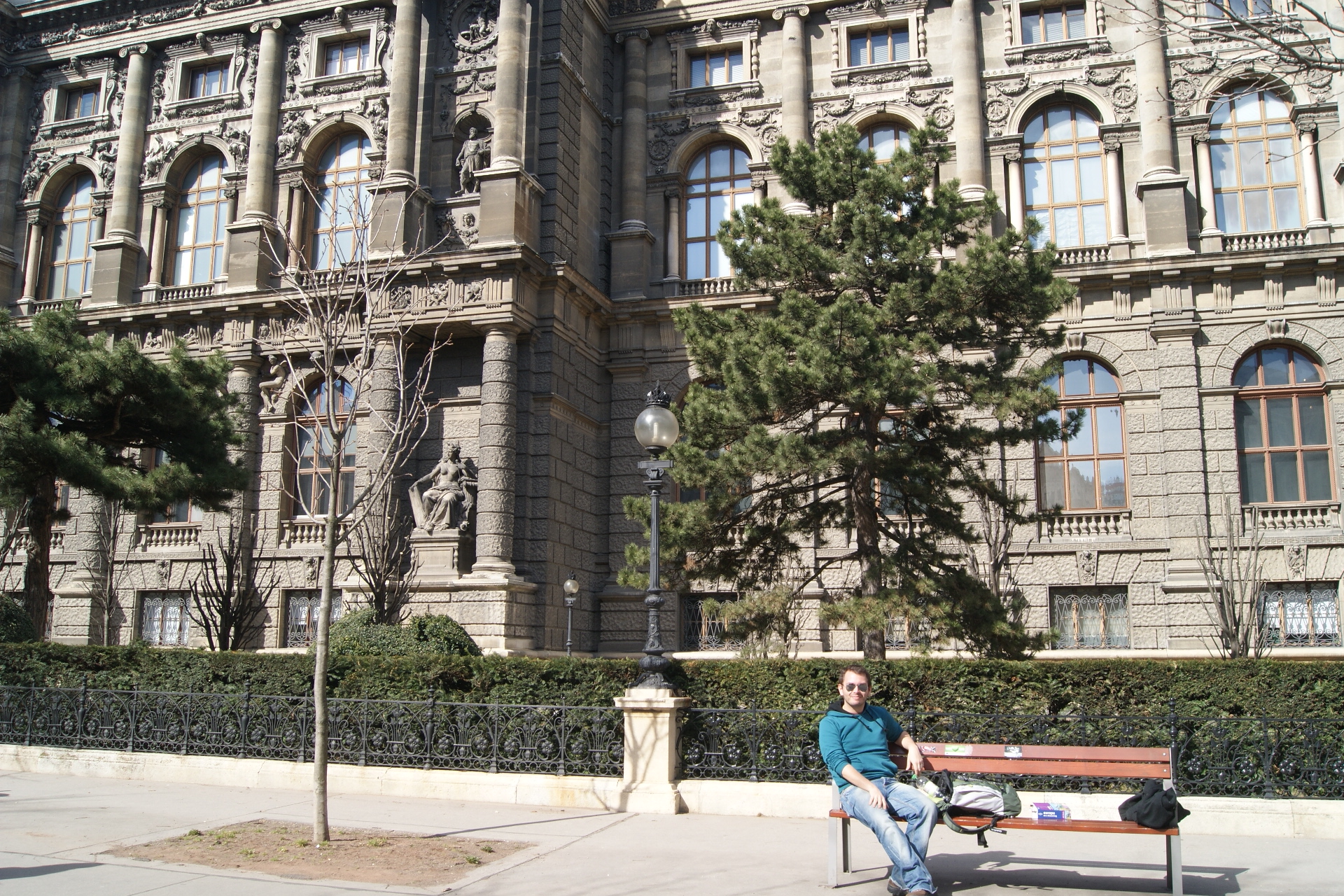 al acabar la plaza, me acerqué hasta el tranvia, y crucé hacia la zona del Hofburg, y la biblioteca de Viena, sitio en el cual busqué un asiento y me dedique simplemente a observar…el fresco de la mañana comenzaba a irse dando paso a una mañana bastante primaveral, asi que tambien me dediqué a ordenar lo de la mochila…no se porqué pero me venian dando ciertos dolores por el peso, asi que a tirar cosas… pero entre el orden, no encontraba la reserva para Vaduz, miré y miré, y nada…pensé que quizas nunca se hizo, o que no hacía falta…me comunique con Gregori y lo mas sensato era buscar una oficina de los trenes austriacos y hacerla; tenia tiempo por delante