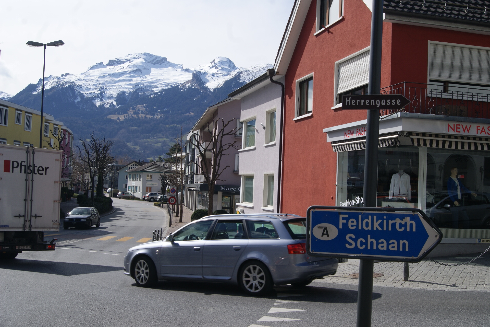 pregunté por algún cartel que dijera lo de «Bienvenido a Vaduz», pero no lo había, según la chica de la oficina, ese cartel ya se usa como asunto publicitario de exposiciones, museos, y demás, pero en el bus, me di cuenta que pasé por un cartel similar, así que me dirigí hacia allí, una calle doble sentido, la cual une Vaduz, con Schaan, a los pocos metros de andar, encontré lo que buscaba