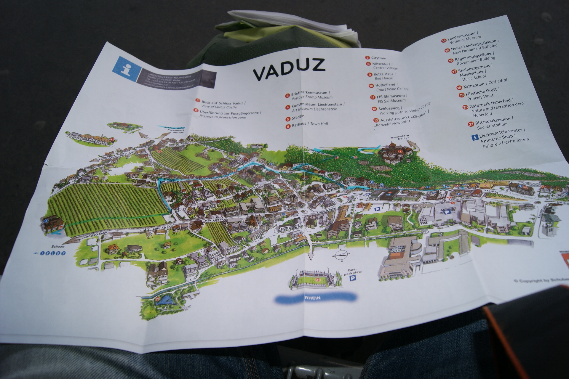 poco antes de las 9, entré a una tienda de souvenirs, compré un plato metálico con la inscripción de Liechtenstein y el parche para la mochila por 12 francos, de ahí me dirigí a la oficina de turismo, en la cual me entregaron un mapa bastante grande con lo más interesante de la ciudad, además me ofrecieron sellarme el pasaporte por 2€, lo hice 🙂